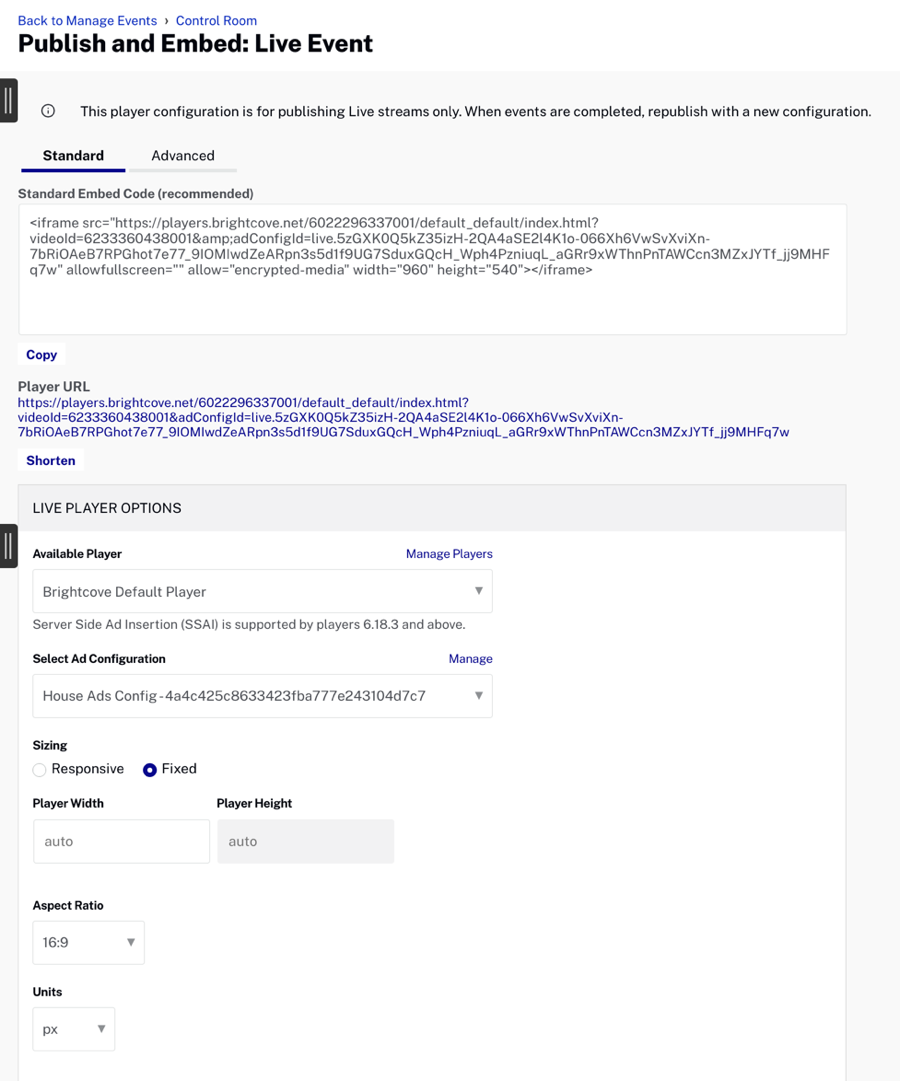 - Clique le URL du lecteur pour prévisualiser l'événement dans un navigateur ou copier le code d'intégration approprié à utiliser.