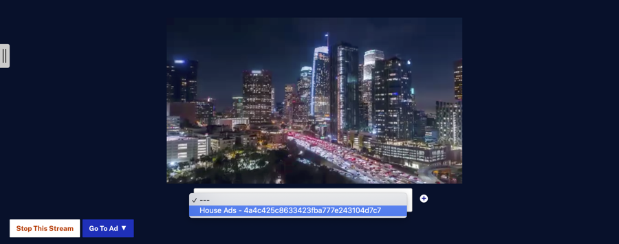 - Par défaut, le lecteur d'aperçu de la salle de contrôle affiche le flux sans publicité. Les annonces ne seront pas affichées dans le Salle de contrôle sauf si une configuration d'annonce en direct est sélectionnée. Utilisez le menu déroulant ci-dessous jusqu'au lecteur pour sélectionner une configuration publicitaire.