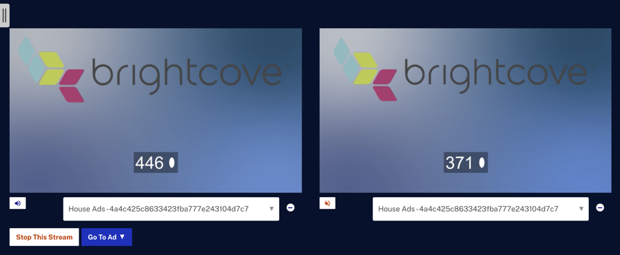Cliquez sur pour insérer une coupure publicitaire dans le flux en direct. Si l'annonce ne remplit pas la totalité du temps de pause publicitaire, l'ardoise de remplissage (sélectionnée lors de la création de l'événement) s'affiche. Les annonces seront vues dans le Salle de contrôle lecteur de prévisualisation et dans les lecteurs publiés à l'aide du module Live. Cet exemple montre 2 annonces affichées dans le Salle de contrôle.