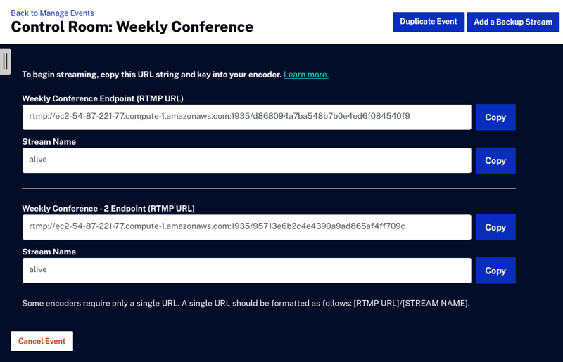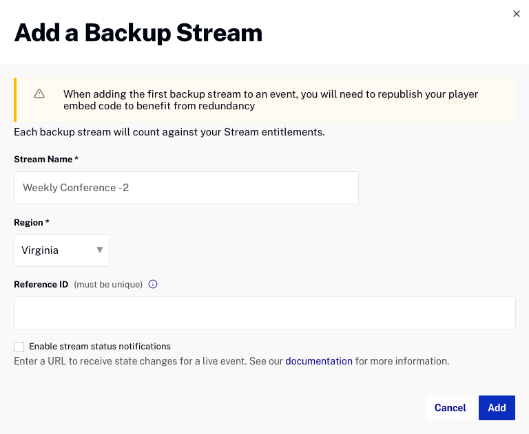 - Cliquez sur + Ajouter un flux de sauvegarde pour ajouter un flux de sauvegarde (redondant) à l'événement en direct. Vous pouvez ajouter autant de flux de sauvegarde que votre compte le permet.