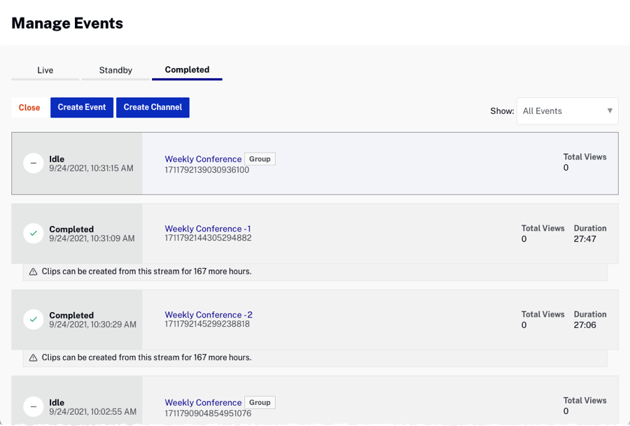 - Sur le Gérer les événements page, cliquez sur le Complété languette.