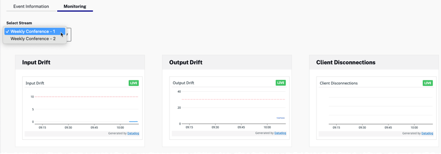 Cliquez sur l'onglet Monitoring situé sous le lecteur d'aperçu pour afficher les informations de surveillance. La surveillance est disponible pour chaque cours d'eau en sélectionnant le cours d'eau souhaité dans la liste déroulante.