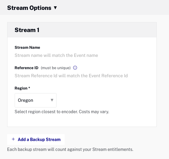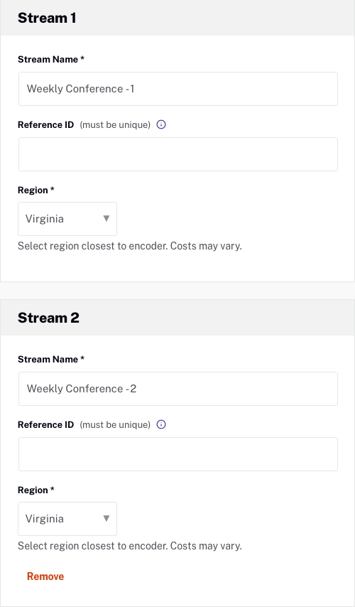 - Nommez vos flux primaire et secondaire, et sélectionnez la région la plus proche de l'endroit où se trouve votre encodeur. Par défaut, la région est définie sur l'Oregon (ouest des États-Unis), ce qui peut entraîner une dégradation des performances si vous diffusez en continu à partir d'un autre continent. L' ID de référence est un identificateur facultatif pour usage interne et doit être unique (maximum 150 caractères).