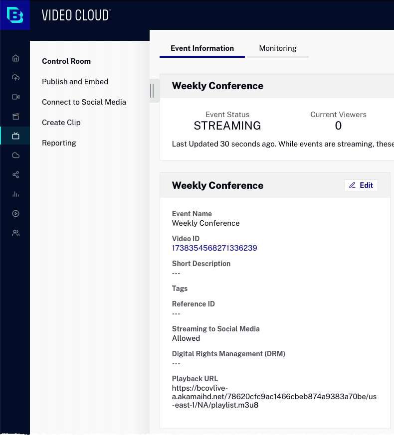 - Créez un événement en direct à l'aide du module Live. Pour des informations complètes sur la création d'un événement en direct, voir Création et gestion d'événements en direct à l'aide du module Live.