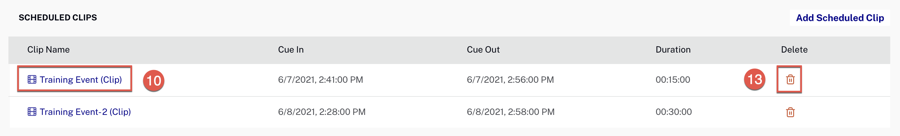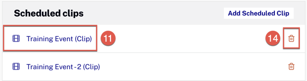 - Pour supprimer un clip programmé, cliquez sur l'icône de la corbeille.