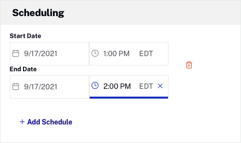- Cliquez sur + Add Schedule et saisissez la date de début et la date de fin de l'événement.