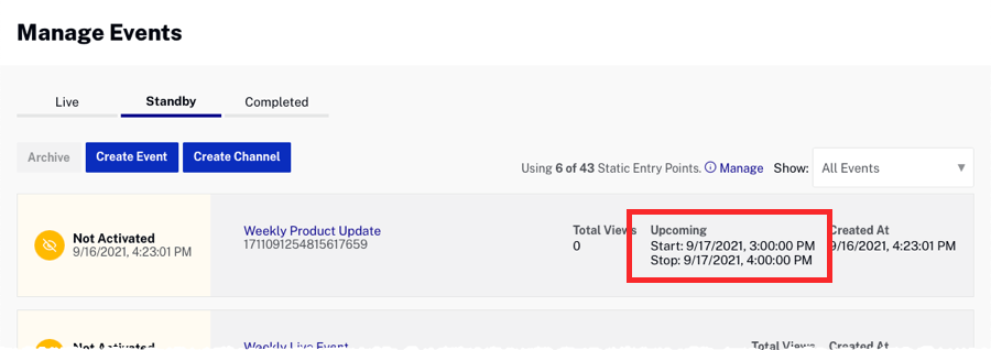 Pour afficher tous les événements planifiés, cliquez sur le Etre prêt languette. Le prochain à venir Démarrer et Arrêter les dates sont indiquées sous A venir Titre.