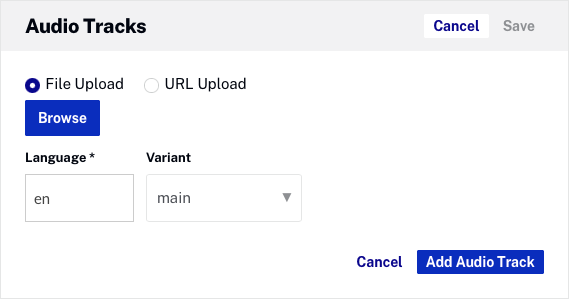 - Téléchargement de fichiers : cliquez sur Parcourir et sélectionnez le fichier de piste audio dans le système de fichiers local. Le fichier sera téléchargé dans Video Cloud.
