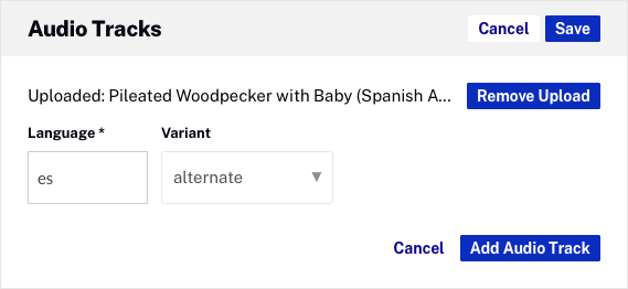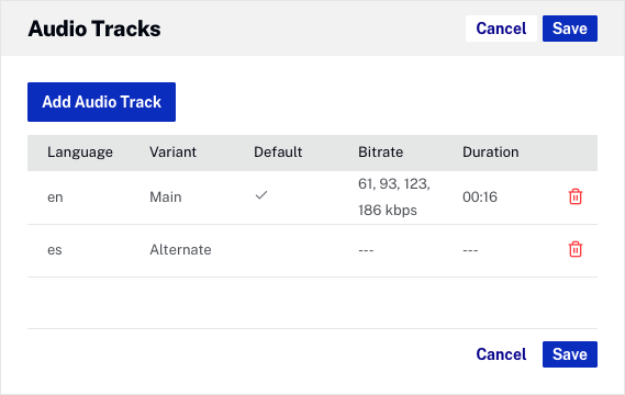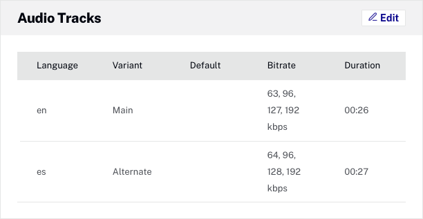 Les fichiers de piste audio peuvent être téléchargés et hébergés par Brightcove ou résider sur une URL accessible par Internet. Pour afficher et modifier les propriétés de piste audio d'une vidéo, procédez comme suit :