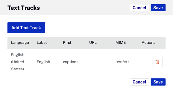 Si des pistes de texte ont été désignées comme pistes par défaut, elles s'afficheront en gras. Pour supprimer une piste de texte, cliquez sur l'icône de suppression (