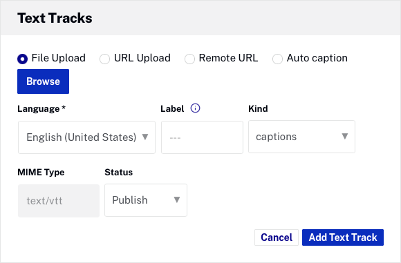 - Téléchargement de fichiers : cliquez sur Parcourir et sélectionnez le fichier de piste de texte dans le système de fichiers. Le fichier sera téléchargé dans Video Cloud.
