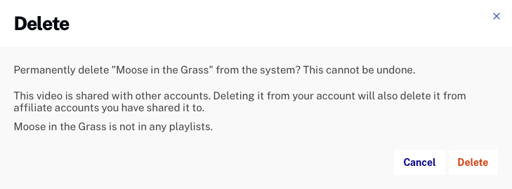 Lorsqu'une vidéo partagée est supprimée d'un compte maître, un message s'affiche vous rappelant que la suppression de la vidéo partagée la supprimera de tous les comptes affiliés avec lesquels vous l'avez partagée.