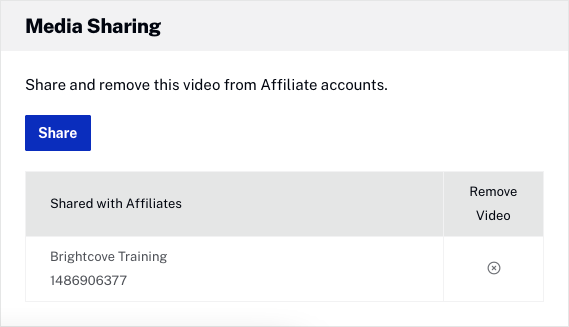 Le partage de médias permet aux éditeurs de charger des vidéos une première fois, puis de les partager sur d'autres comptes. Ces comptes peuvent être les vôtres, ceux de l'entreprise ou ceux d'autres éditeurs. Les vidéos partagées peuvent ensuite être utilisées indépendamment dans les autres comptes Brightcove. Le partage de médias s'utilise généralement lorsque les éditeurs souhaitent conserver un contenu vidéo sur un compte principal puis partager les vidéos avec d'autres divisions ou filiales de l'organisation.