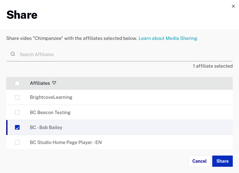 - Sélectionnez le (s) compte (s) affilié (s) sur lequel partager les vidéos, puis cliquez sur Partager. Le champ de recherche peut être utilisé pour rechercher un ID de compte. Le champ de recherche prend en charge les recherches floues, de sorte que la saisie d'une partie d'un ID renvoie les correspondances.
