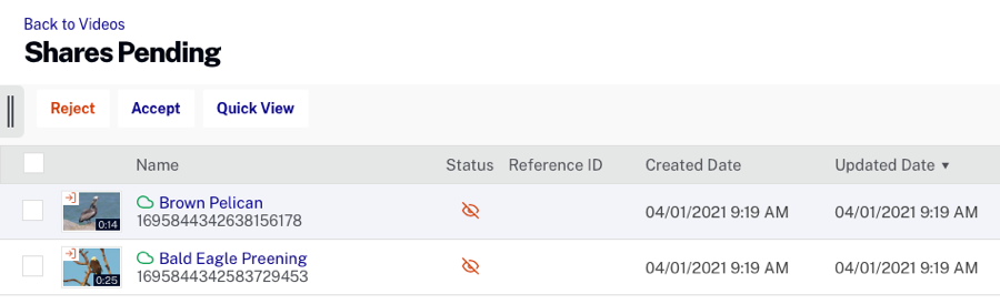 - Reject : rejeter la vidéo partagée et ne pas l'inclure dans votre compte. Le rejet d'une vidéo partagée n'empêche pas le maître de la partager à nouveau sur votre compte à l'avenir.
