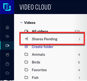 Les comptes affiliés ont la possibilité de configurer un mode d'acceptation pour chaque compte principal. Lorsque le mode Acceptation est Auto, les vidéos partagées apparaissent dans la liste des vidéos du compte affilié dans le module Media. Quand le Mode d'acceptation est Manuel , un Partages en attente un lien affichant le nombre de vidéos partagées apparaîtra dans le module Médias.