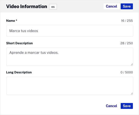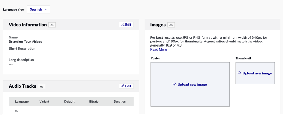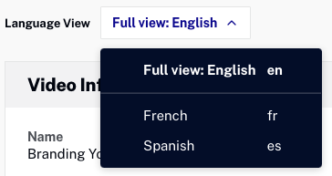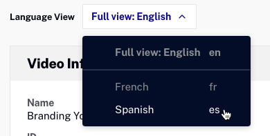 Lorsque la page des propriétés de la vidéo s'ouvre, les métadonnées vidéo s'affichent dans la langue principale. Le sélecteur de langue s'affiche au-dessus de la section Informations vidéo et indique la langue principale. Cliquez sur le bouton pour sélectionner une autre langue. Dans cet exemple, l'anglais a été configuré comme langue principale et le français et l'espagnol ont été ajoutés en tant que langues supplémentaires.