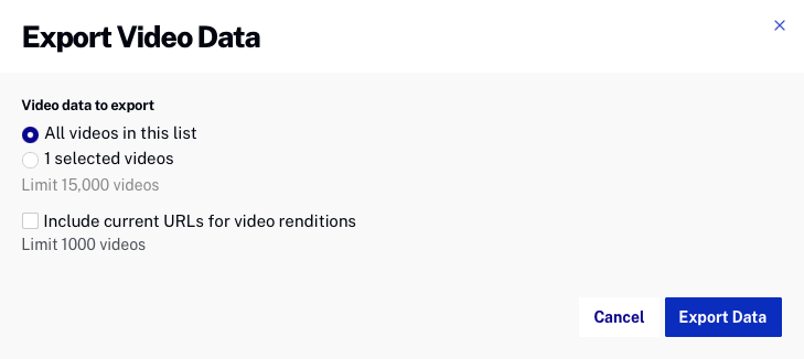 - Brightcove recommande d'exporter moins de 15 000 vidéos à la fois. Si vous devez exporter plus de 15 000 vidéos, utilisez la fonction de recherche pour renvoyer un sous-ensemble de vidéos et exporter plusieurs « lots » à la fois.