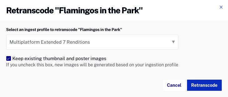 - Vérifier Conserver les images de vignettes et d'affiche existantes pour conserver les images existantes. Si vous décochez cette case, de nouvelles images seront générées en fonction des paramètres d'image dans le profil d'ingest sélectionné.