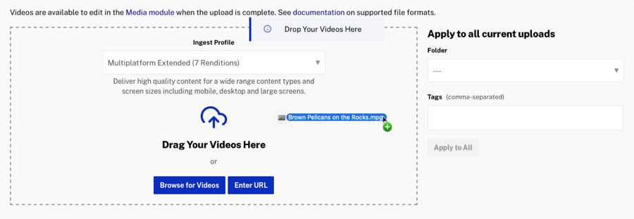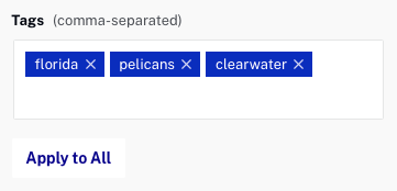 Les tags peuvent également être attribués aux vidéos au fur et à mesure de leur téléchargement. Saisissez une liste de balises séparées par des virgules à attribuer aux vidéos.