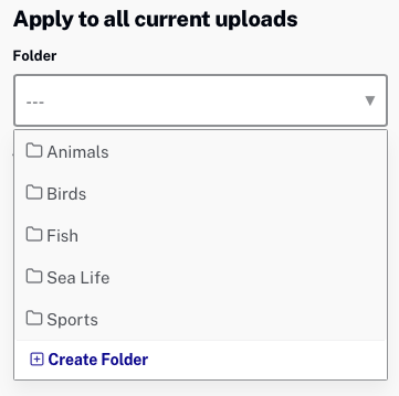 Lors du téléchargement de vidéos, un dossier et des balises pour les vidéos en cours de téléchargement peuvent être spécifiés. La liste déroulante des dossiers affichera une liste de tous les dossiers qui ont été créés dans le module Média. Cliquez sur + Créer un dossier pour créer un nouveau dossier et y affecter la ou les vidéos. Lors de la création d'un nouveau dossier :