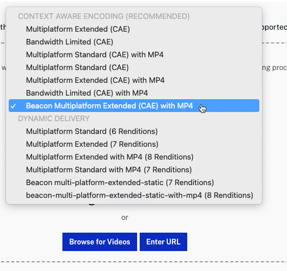 Avant de télécharger des vidéos, sélectionnez un profil d'intégration. Le profil d'acquisition contient les paramètres de transcodage qui seront utilisés lors du transcodage des vidéos. La liste des profils d'acquisition disponibles varie en fonction de la configuration de votre compte Video Cloud. Dans la capture d'écran suivante, les deux CONTEXT AWARE ENCODING et DYNAMIC DELIVERY des profils sont disponibles.