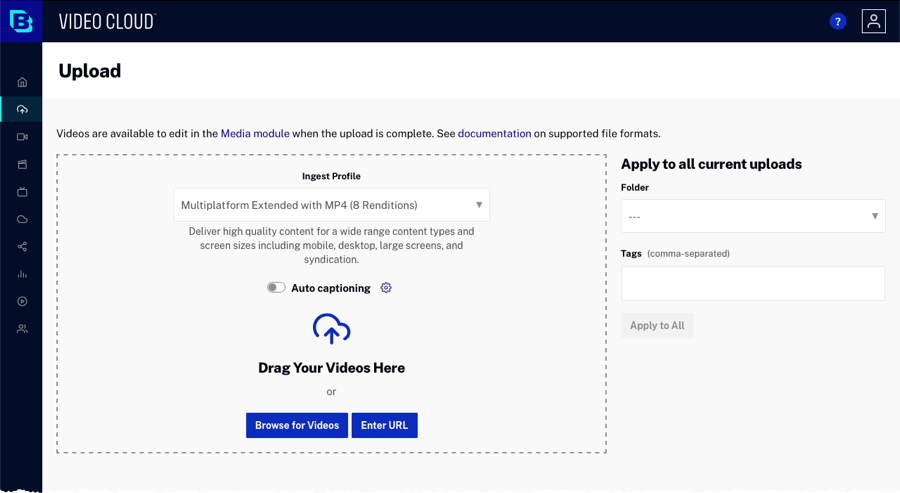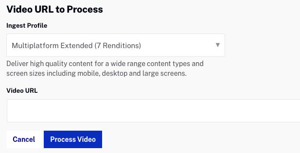 Les rendus vidéo créés sont basés sur le profil d'acquisition sélectionné. Pour plus de détails sur les profils d'acquisition fournis par Brightcove, reportez-vous à Profils d'ingestion standard pour la livraison dynamique et le codage contextuel