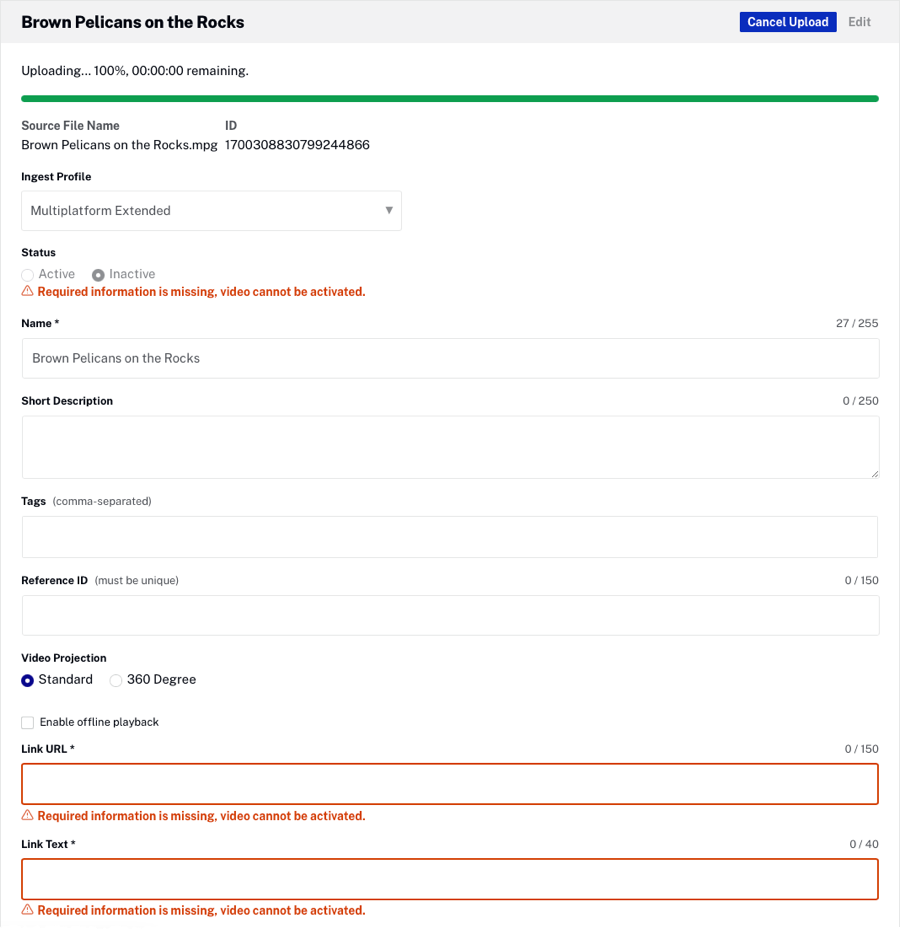 Par défaut, lorsqu'une vidéo est téléchargée, le statut est défini sur Actif à moins que les champs obligatoires ne soient manquants. Si les champs obligatoires sont manquants, un message s'affiche avec les champs obligatoires en surbrillance en rouge. Les vidéos avec des champs obligatoires manquants peuvent toujours être téléchargées, mais elles resteront inactives jusqu'à ce que tous les champs obligatoires aient des valeurs. Pour un complément d'information sur les champs obligatoires, consultez Mise en place des champs obligatoires des vidéos.
