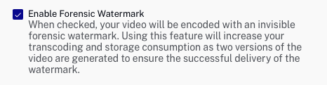 Si le compte est activé pour le filigrane judiciaire et qu'un profil d'ingestion Dynamic Delivery est sélectionné, une option permettant d'activer le filigrane judiciaire s'affiche.