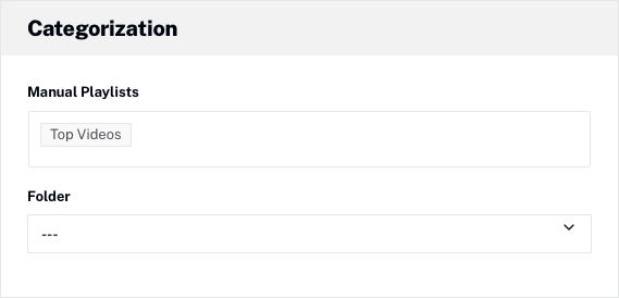 Pour voir les sélections manuelles dans lesquelles se trouve les vidéos, cliquez sur le titre de la vidéo pour ouvrir les propriétés de la vidéo. Les Catégorisation properties affichera les listes de lecture manuelles auxquelles la vidéo a été ajoutée.