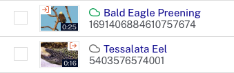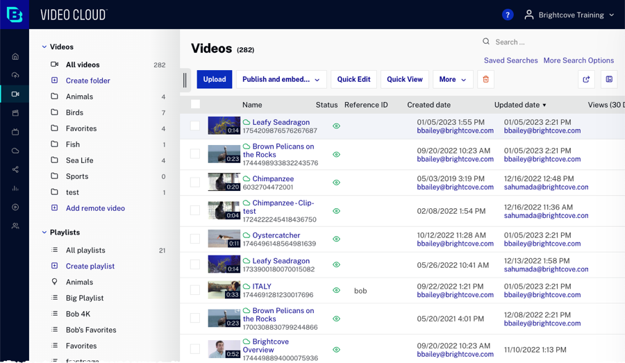 L'ID utilisateur de l'utilisateur qui a créé et/ou mis à jour la vidéo sera affiché dans les colonnes Date de création/Date de mise à jour. Si l'action a été effectuée via l'API CMS, Mis à jour par l'API sera affiché. Notez que si un utilisateur qui a effectué une action est supprimé d'un compte, son ID apparaît toujours.
