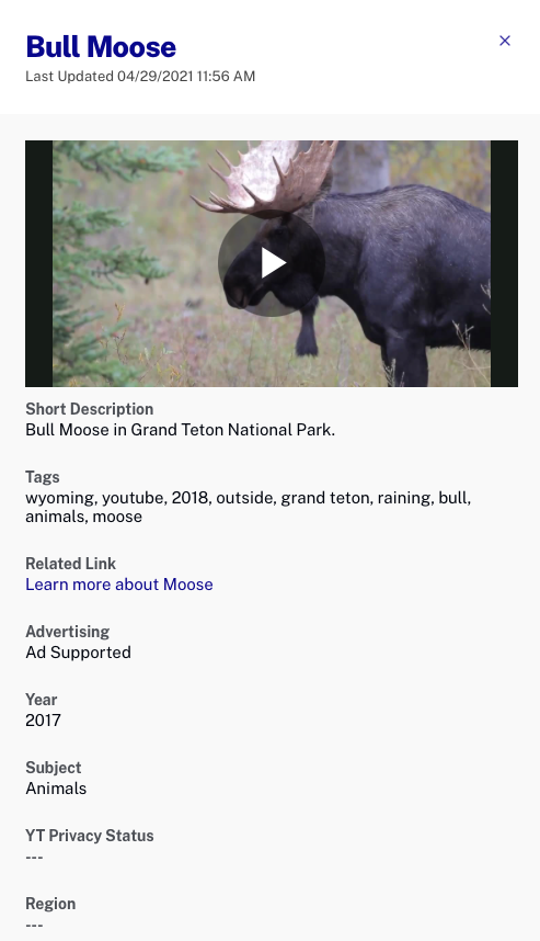 Pour modifier les propriétés d'une vidéo, cliquez sur son nom pour ouvrir la page des propriétés vidéo. Voir Modification des propriétés vidéo avec le module multimédia pour plus d'informations sur l'édition des propriétés vidéo à l'aide du module Média. Pour modifier les propriétés vidéo de plusieurs vidéos en même temps, utilisez le Edition rapide caractéristique.