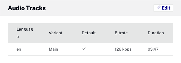 Si la vidéo a été téléchargée et transcodée à l'aide d'un profil d'ingestion de diffusion dynamique ou d'encodage tenant compte du contexte, la section Pistes audio s'affiche et contient des informations sur les formats associés audio disponibles. Pour plus d'informations sur l'ajout de pistes audio supplémentaires à une vidéo, voir Ajout de pistes audio à des vidéos à l'aide du module multimédia.