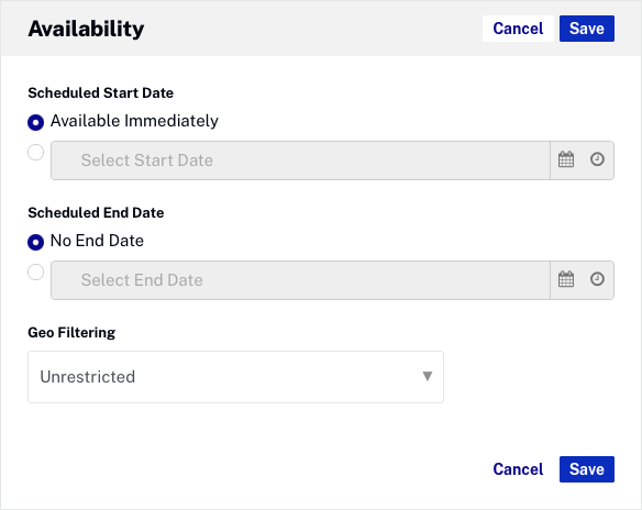 La section Availability affiche les paramètres de disponibilité de la vidéo. Pour plus d’informations sur la configuration des paramètres de disponibilité, consultez Configuration de la disponibilité des vidéos.