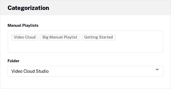 La section Catégorisation affiche les Listes de lecture manuelles la vidéo est attribuée et le Dossier la vidéo est en. Pour modifier les propriétés, effectuez des modifications directement dans cette section. Appuyez sur Entrée pour enregistrer les modifications.