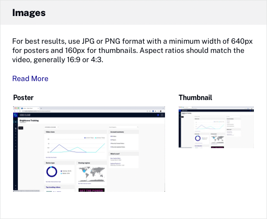 La section Images affiche l'image et la vignette de la vidéo. L'image et la vignette sont créées automatiquement en prenant un instantané de la vidéo source à son milieu. Si les images prises par défaut ne vous conviennent pas, vous pouvez en capturer de nouvelles ou en charger d’autres. Survolez l'image de l'affiche / vignette et cliquez sur l'icône d'affichage (