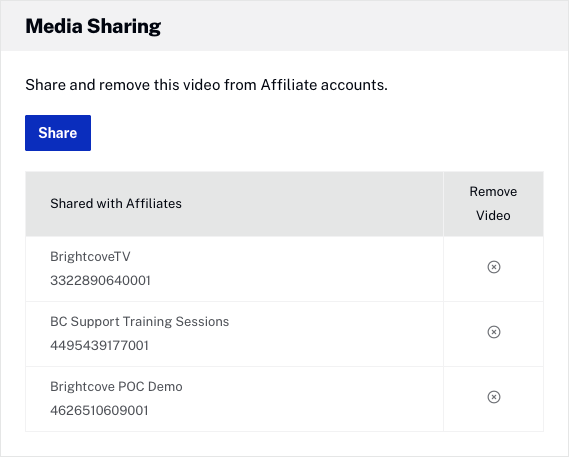 Si la vidéo a été partagée sur un compte affilié, la section Partage de médias s'affiche et répertorie les affiliés à qui la vidéo a été partagée. Pour plus d'informations sur le partage multimédia, consultez Partage multimédia à l'aide du module multimédia.