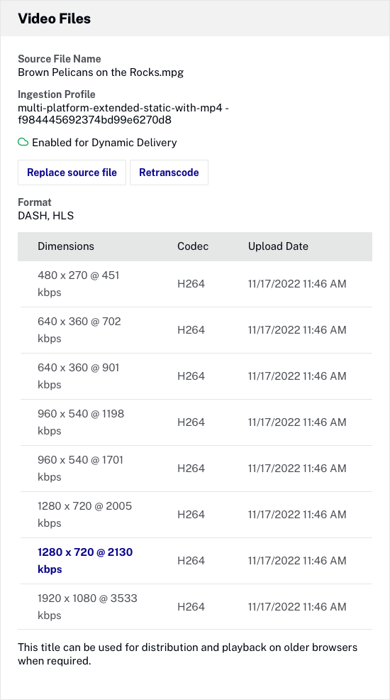 Dans cet exemple, le transcodage Dynamic Delivery a été utilisé lors du téléchargement de la vidéo.