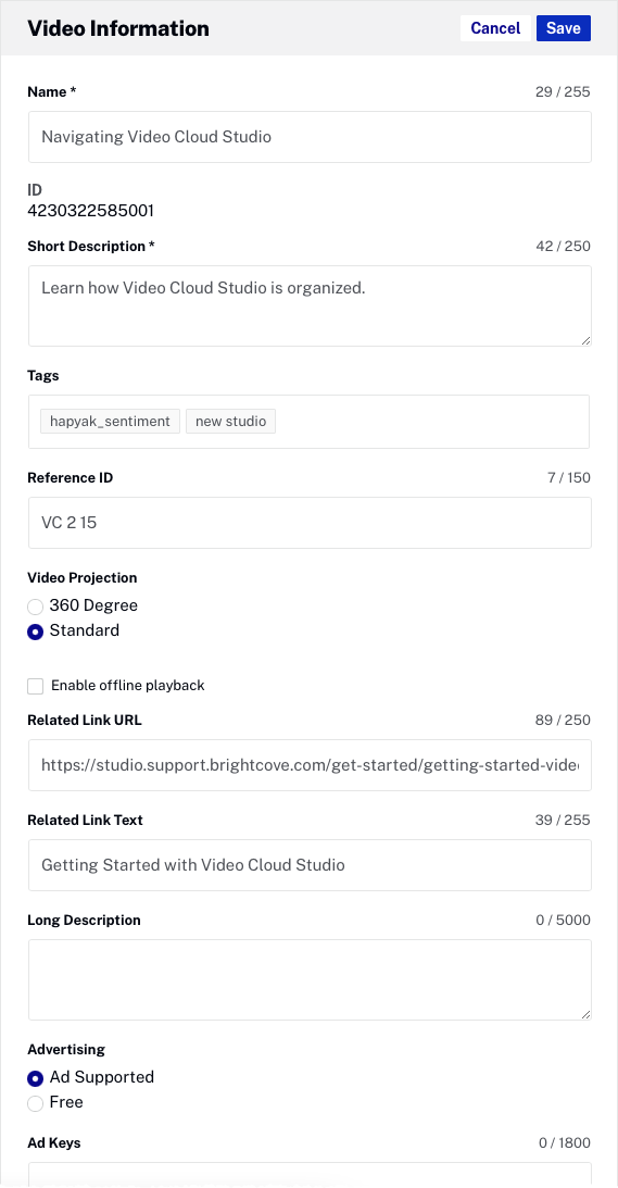 Le volet Details liste tous les champs obligatoires dans votre compte Video Cloud. Si une vidéo est inactive, vous pouvez la modifier librement et sauvegarder ses métadonnées dans le module Médias sans saisir toutes les métadonnées obligatoires. En outre, les vidéos ne peuvent pas être activées tant que toutes les métadonnées obligatoires n’ont pas été saisies. Si une vidéo est déjà active, vous ne pouvez pas enregistrer les modifications apportées à la section à moins que vous ne fournissiez toutes les métadonnées obligatoires de cette section ou que vous ne désactiviez la vidéo. Pour un complément d'information sur les champs obligatoires, consultez Mise en place des champs obligatoires des vidéos.
