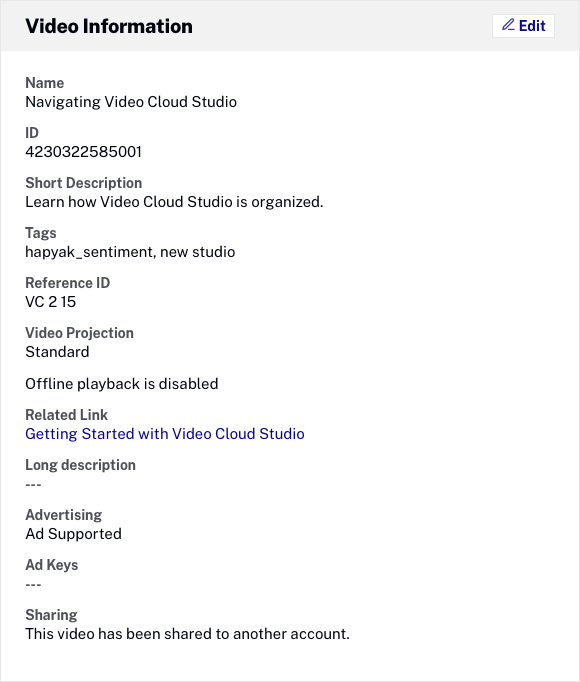 Pour modifier les propriétés vidéo, cliquez sur le bouton Edit dans la section ou double-cliquez dans la section. Certaines sections permettent de modifier directement les propriétés (c.-à-d. catégorisation).