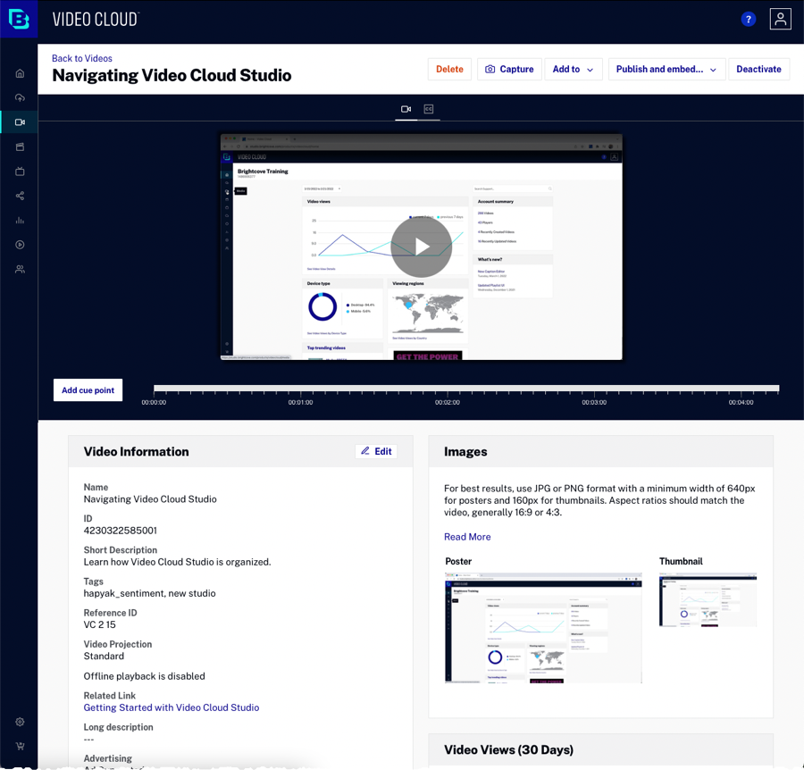 Si la vidéo est activée, le bouton Deactivate permet de la désactiver. Si la vidéo est désactivée, le bouton Activate permet de l’activer. Les vidéos désactivées ne peuvent pas être lues dans un lecteur Brightcove.