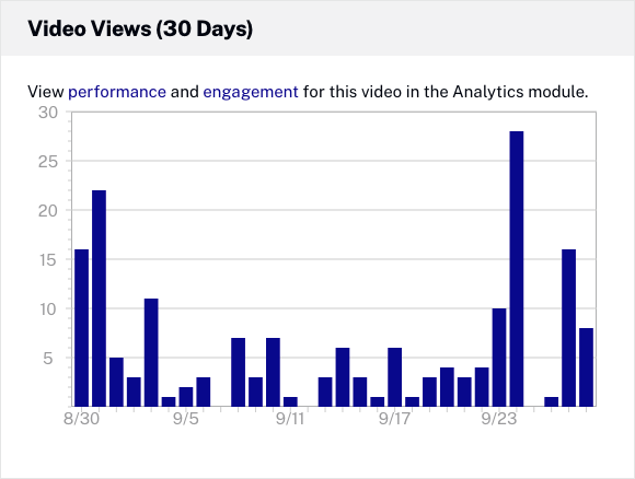 La section Vues vidéo affiche le nombre de vues vidéo au cours des 30 derniers jours. Cliquez sur les liens pour ouvrir les rapports de performance ou d'engagement pour plus d'informations.