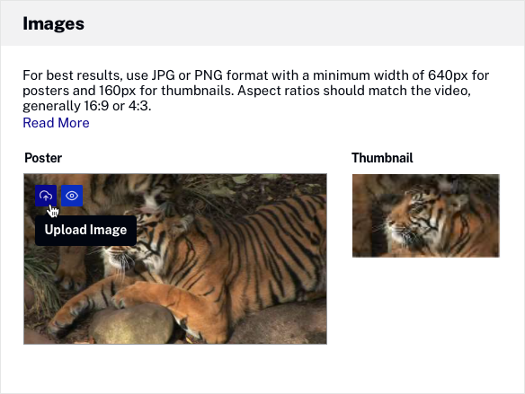 Lorsque vous téléchargez de nouvelles images d'affiche et de vignettes, les dimensions de l'image sont basées sur les dimensions d'image spécifiées dans le profil d'ingeste par défaut du compte. Pour plus d'informations sur l'amélioration de la qualité des affiches et des images miniatures, voir Amélioration de la qualité des affiches et des images miniatures.