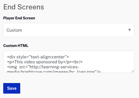 Lorsque l'option Custom est sélectionnée, du HTML personnalisé peut être utilisé pour afficher du texte ou des images supplémentaires au-dessus des icônes de relecture et de partage. Pour configurer un écran de fin personnalisé, sélectionnez Douane et collez-le en HTML à afficher dans le HTML personnalisé propriété.