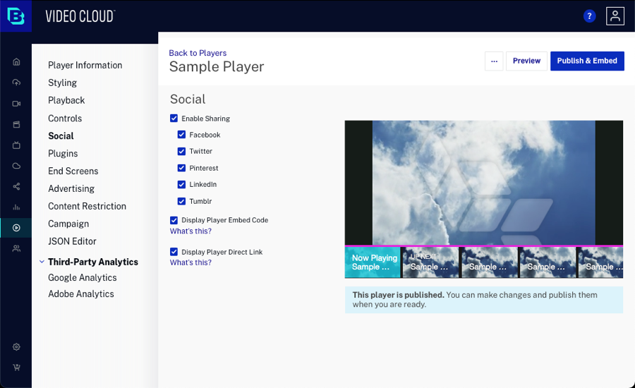 - Vérifier Afficher le code intégré du lecteur pour permettre au spectateur de copier le code d'intégration du lecteur lorsque les options de partage social sont affichées.