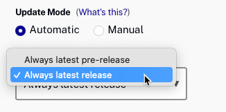 - Préversion toujours la plus récente - Cette option entraînera automatiquement la mise à jour de la version du lecteur vers la dernière version pré-version (ou version de sortie s'il n'y a pas de version préalable disponible), car de nouvelles versions pré-version sont disponibles.