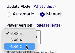 Dans Manuel mode, les joueurs ne seront pas automatiquement mis à jour. Ce procédé est également appelé « verrouillage » du lecteur. Lorsque cette option est choisie pour un joueur, ce joueur ne fera pas partie du processus de sortie géré et restera à la version choisie. Vous devriez réfléchir attentivement avant de choisir ce mode car cela signifie que vous n'obtiendrez plus de corrections automatiques de bogues ou d'améliorations de fonctionnalités. À un moment donné, les anciennes versions des joueurs ne seront plus prises en charge. Nous vous recommandons ainsi d'utiliser le mode Manual uniquement en tant que solution temporaire en attendant de résoudre les problèmes entre la version actuelle du lecteur et la dernière version. Quand Manuel est sélectionné, une version spécifique du lecteur peut être sélectionnée à l'aide du Version du joueur la liste déroulante.