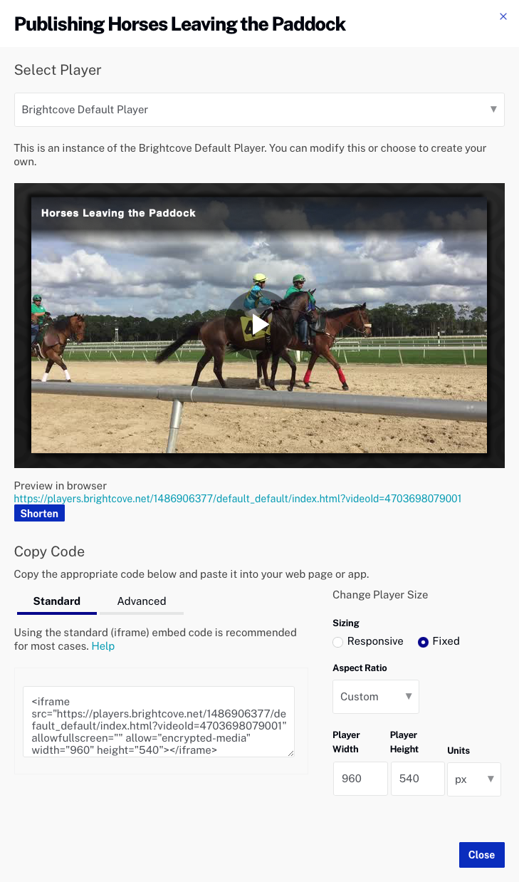 - (Facultatif) Le lien de prévisualisation sous le lecteur de prévisualisation peut être utilisé pour prévisualiser le lecteur dans un autre onglet du navigateur. Clique le Raccourcir bouton pour générer une URL raccourcie.