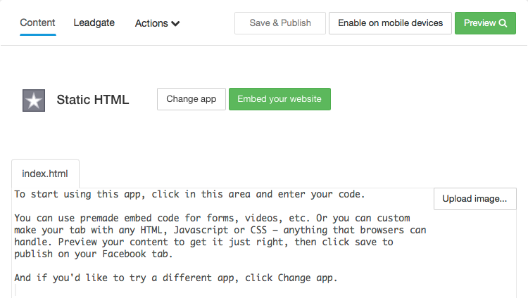 Le processus décrit ci-dessous utilise une application que vous ajoutez à votre compte Facebook. Cette application crée un onglet sur votre page Facebook, dans lequel vous pouvez coller le HTML statique de ce que vous voulez y afficher. Plusieurs autres applications proposent une telle fonctionnalité. Pour effectuer les étapes ci-dessous, vous devrez avoir créé une page Facebook. Si ce n'est pas le cas, cliquez ici pour en créer une.