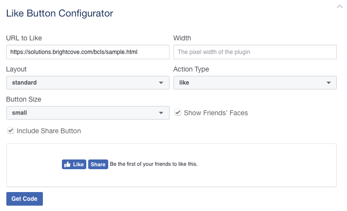 - Spécifiez les préférences de votre bouton « J'aime » dans le formulaire de configuration comme indiqué sur la page. Dans le URL à aimer case, entrez l'URL de la page hébergeant votre lecteur.